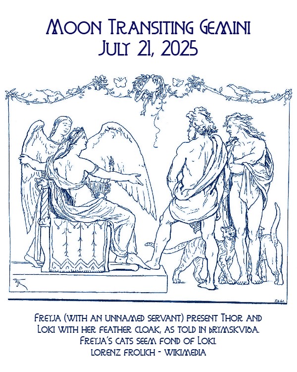 Moon transiting Gemini, Monday, July 21st, offers you a gift from the Gods which may seem part blessing and part curse because it requires you to release and/or accept something so you can make practical use of what is before you in order to manifest your desire or achieve success, as the moon conjunct Venus in Gemini forms a Thor’s Hammer aspect pattern with Mars conjunct the South Node in Virgo and Pluto retrograde in Aquarius, as well as a sextile aspect with Mercury retrograde in Leo, which is sesquisquare to Saturn conjunct Neptune, both retrograde in Aries. The South Node and four retrograde planets in this mix of unusual, but potentially transforming and empowering energy, turns your attention to the past – perhaps as far back as past lives. Maybe this time, while Jupiter is exalted in Cancer and square to Saturn and Neptune in Aries, you can accept that you deserve something bigger and better and will follow through with the care, devotion, and discipline needed to make it grow. A Cradle/Angel Wings aspect pattern of the sun in the final degree of Cancer, Pluto in Aquarius, Saturn and Neptune in Aries, and Uranus in Gemini provides a quickening of the spirit and encourages cooperation or assistance between you and another, or others, to transcend current limitations and instigate change. The mutable quality of the moon and Venus in Gemini squaring Mars in Virgo is rife with “what ifs” and some hesitancy to pursue your heart’s guidance, perhaps due to what you think of as past mistakes, but choosing to reject love, help, or opportunities is not in alignment with the sesquisquare aspect between Mercury and Saturn conjunct Neptune, which is subliminally telling you that there is a reason or lesson within the situation or connection, and that you have the courage, faith, and wisdom to see it through, even while a T-square aspect pattern of Chiron in Aries, the sun, and Pluto, sets an undertone of deadly serious, do-or-die trying awareness which can either galvanize you to overcome your fear and resistance or make you want to retreat or hide. The thunder (power) and lightning (change) of Thor is conveyed through Pluto in Aquarius and the Thor’s Hammer pattern, the charming trickster energy of Loki comes to you via the moon and Venus in Gemini, and the practical help or opportunity to take something to the next level or to restore some sort of order to a disordered or confused area of your life is being channeled through Mars and the South Node in Virgo reflecting Freya, who loaned her falcon feather cloak to Loki, so he could fly quickly to retrieve Thor’s Hammer. Mercury retrograde in Leo holds latent hero energy, and Chiron in Aries is a warrior poised for the call to action. You may play the role of activator and/or facilitator in a pivotal life move for someone else, or there may be a person who stars in those roles for you now. Open yourself to the possibility that the process of growth and change is just as important and meaningful to you and the people you work or play with as any end goal, and you will find yourself loving more and fearing less as you live in the present moment, which is where you are scripting the story of your tomorrow.