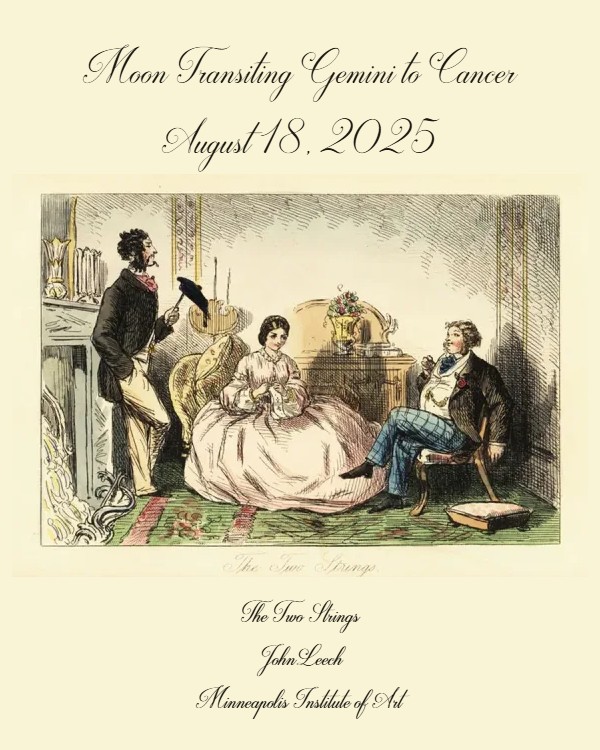 Moon transiting Gemini to Cancer, Monday, August 18th, highlights the awareness and deliberate use of social etiquette and strategic moves, especially concerning business negotiations, family dynamics, or romantic courtship, as the moon forms a Minor Grand Trine aspect pattern with Chiron in Aries and the sun in Leo, and a T-square aspect pattern with Mars in Libra, and Saturn conjunct Neptune, both retrograde in Aries. Everyone today will be focused on how they are presenting themselves, and an unfulfilled need or long range goal is the hidden motivation behind the increase of communication and social interaction, due to a Mystic Rectangle aspect pattern involving Mercury in Leo, Mars in Libra, Saturn and Neptune in Aries, and Pluto in Aquarius. You may feel causal and detached, with a touch of curiosity and excitement, in the early half of your day as the moon completes its transit through the mutable air sign of Gemini, but when the moon enters the cardinal water sign of Cancer this afternoon, feelings turn deeper, and the desire for attainment, satisfaction, and security in your finances and relationships becomes a priority, as the Cancer moon creates a resonance with the conjunction of Venus and Jupiter in Cancer, which square both Mars and Chiron, but are trine to Saturn and Neptune. If you have thought or plans you wish to present or propose to others, choose the first half of the day to do so, while minds are more open and people are more flexible. If you look good, sound good, and follow the rules of social etiquette, you may convince someone of something which will bring you, and them, an increase in wealth or happiness. Competition could be around you, but focusing too much on them will distract you from your goal and the work of putting your best self forward. It is not always the best who wins, but the most polite, persistent, and persuasive.