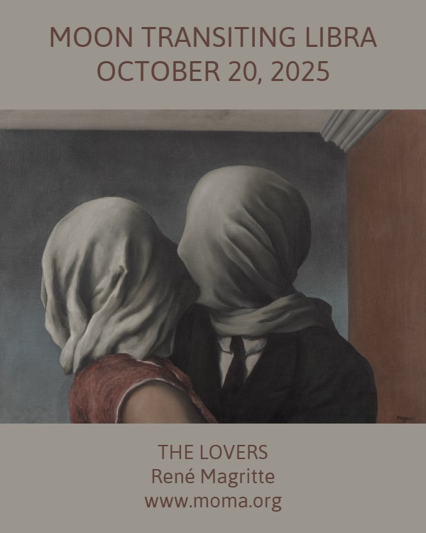 Moon transiting Libra, Monday, October 20th, turns your attention toward exploring what you, or the “other” hides in relating, and using the awareness you gain to transcend the limitations and deepen the intimacy, or to release and remove yourself from a relationship that is not supportive of growth and mutual respect, as the moon nearing the sun in the lead up to tomorrow morning’s New Moon in Libra forms a quincunx aspect with Neptune retrograde in Aries on the cusp of re-entering Pisces, conjunct Saturn retrograde in Pisces, while participating in a Grand Cross aspect pattern with Jupiter in Cancer, Chiron retrograde in Aries, and Pluto in Aquarius. The moon also makes a sesquisquare with Uranus in Gemini, which although being a minor aspect, delivers a restless undercurrent of change, curiosity, and a “Should I, or shouldn’t I?” mood as Uranus plays unchallenged and fully supported in a Grand Trine and Kite with Venus in Libra, Pluto, Saturn, and Neptune. A Grand Trine of Mars conjunct Mercury in Scorpio, Jupiter, Saturn, and Neptune counteracts fear or blockage being activated by the Grand Cross, as it encourages you to share your dreams, secrets, and passion with others authentically. This may reveal the truth of any relationship, as those who respond in kind will draw closer to you and those who don’t will pull away. The planetary patterns right now are creating fertile ground for sowing seeds of trust and a rewarding future between people, and you are responsible for what you plant. Here is a quote from the artist, Rene Magritte, to contemplate as you tune into the New Moon energy and examine your relationships: “Everything we see hides another thing, we always want to see what is hidden by what we see.”